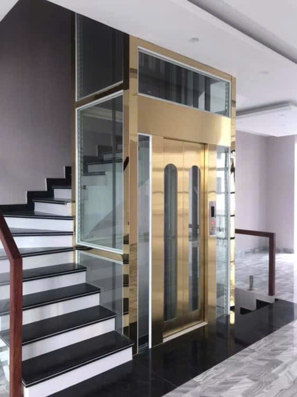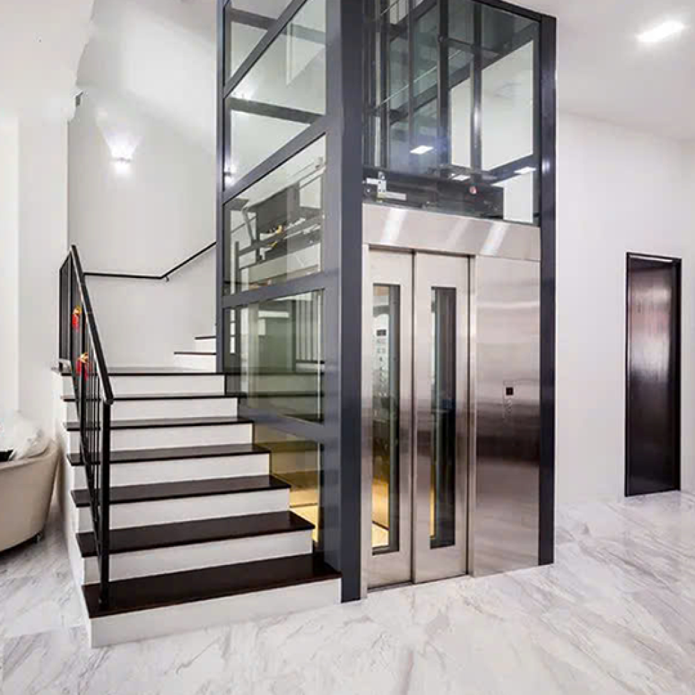 Mẫu thang kính nội bộ thường được sử dụng trong các tòa nhà văn phòng, trung tâm thương mại, giúp tạo không gian mở, sang trọng và tiết kiệm diện tích. Thiết kế của thang kính này thường có cửa kính trong suốt, mang đến cho người sử dụng tầm nhìn rộng rãi và dễ chịu.